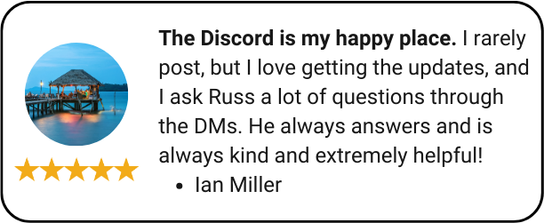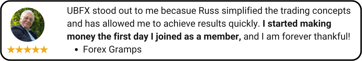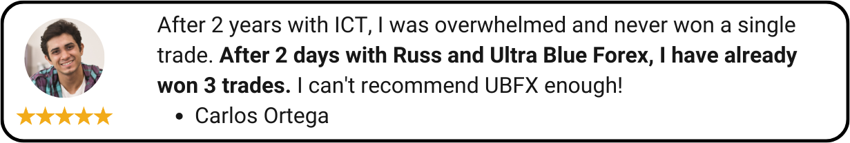 "Russ's laid back teaching style has taught me the value of patience. Russ's calm guidance and Ultra Blue Forex's methodical approach have made me a more disciplined and way more profitable trader."