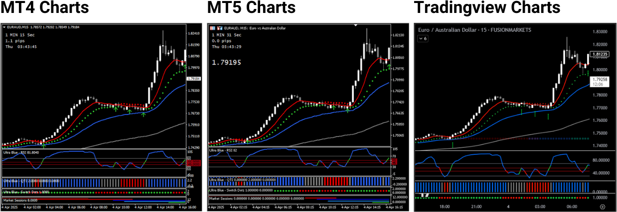 The Ultra Blue Forex Blender system has indicators that are designed to be used on MT4, MT5, and TradingView.